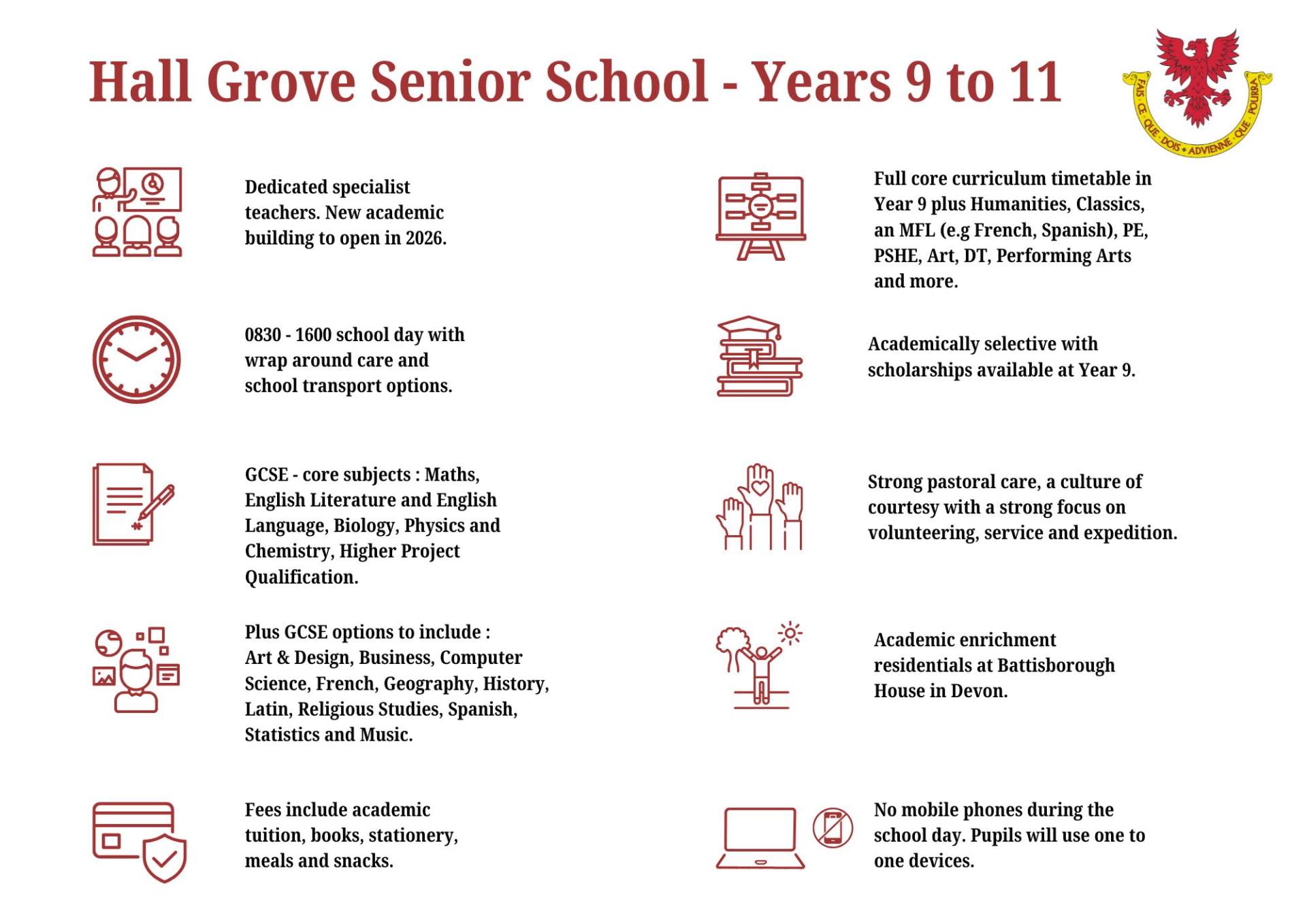 In September 2025, Hall Grove launched a new senior school for children in Years 9-11, allowing pupils to complete their GCSEs within our familiar and supportive environment. This decision was driven by the continued success of our prep school and our commitment to meet the evolving needs of our families. The school started with Year 9, in September 2025, with Year 10 following in 2026 and Year 11 in 2027.